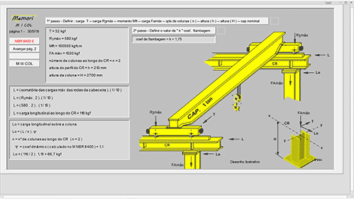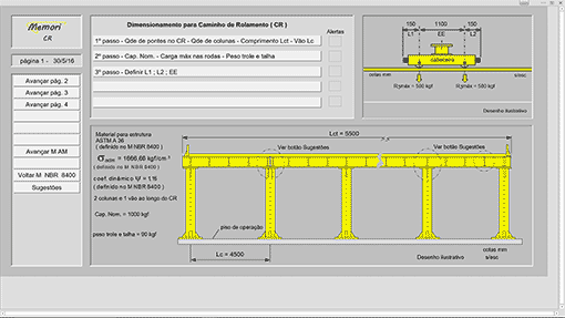 Sistema para o cálculo do caminho de rolamento (CR) com vigas padrão Açominas, laminadas americanas e especiais soldadas. O memorial contempla cálculos até duas pontes rolantes sobre o CR. Inclui o cálculo do dimensionamento da contenção lateral, além de listagem de material e relatório NBR 8400.